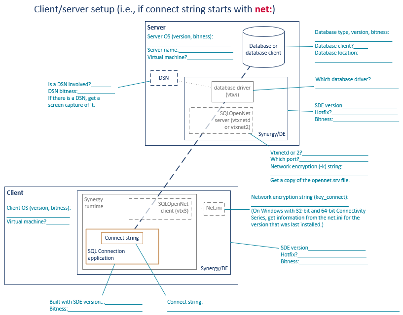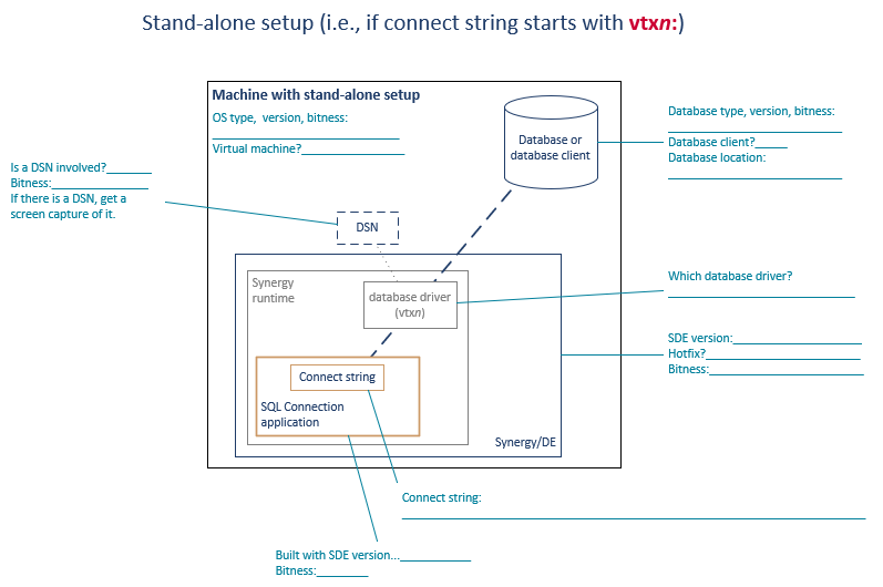 When you encounter an SQL Connection issue, start the troubleshooting process by making sure you have a complete picture of your SQL Connection configuration. Gather all the information mentioned in the applicable setup diagram below (stand-alone or client/server), and note any other configuration details that could be relevant.