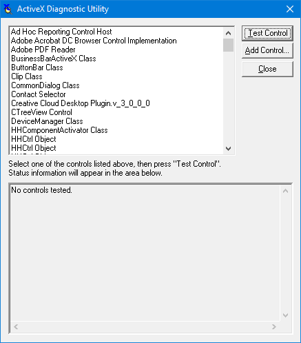 The ActiveX Diagnostic utility enables you to register or test an ActiveX control. Testing a control provides answers to the following questions: