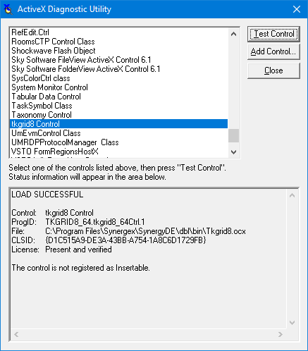 If you cannot load an ActiveX control from your Synergy program, you can use the ActiveX Diagnostic utility to determine whether the control can even be accessed on your system. This eliminates guesswork as to whether the problem lies within your application or in the ActiveX control itself. For example, the ActiveX Diagnostic utility can tell you if a DLL is missing, if the control has not yet been registered, or if the control is not licensed, thus making it inaccessible to your application.