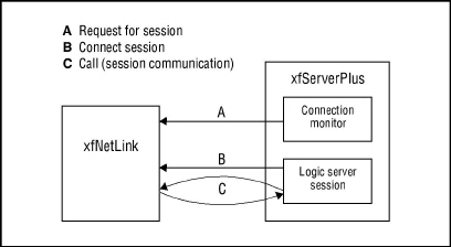 Once the initial socket communication is established (‘A’ in figure 1), the connection monitor signals the logic server to start a session. The connect session time-out (‘B’ in figure 1) is measured from the time that xfNetLink receives the acknowledgment from the connection monitor to the time it receives an acknowledgment from the session started by the logic server in xfServerPlus.