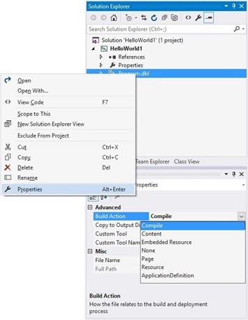 - changing the Build Action for an individual file as illustrated in figure 2 below. (Right-click the file in Solution Explorer, select Properties from the context menu, and change the Build Action setting in the Advanced area of the Properties window.)