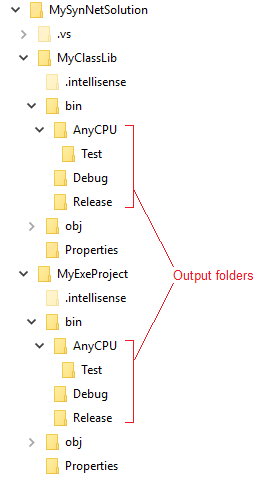 And if you have a Synergy .NET project with Debug, Release, and Test configurations and the Any CPU platform, the default output path settings for these would result in the output folders shown in figure 4.