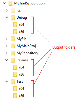 When a project or solution is built, the output path, which is set on the Build page of project properties, determines where built files for the projects will be located. Build page settings are specific to a platform/configuration combination, so there can be as many output folders as there are platform/configuration combinations. For example, if you have a traditional Synergy solution with Debug, Release, and Test solution configurations and x86 and x64 solution platforms, the default output path settings for these configurations and platforms would result in the output folders shown in figure 3.